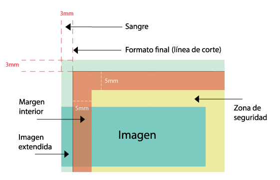 El sangrado consiste en extender los elementos que llegan al borde del documento 2 o 3 mm más allá de la línea de corte.